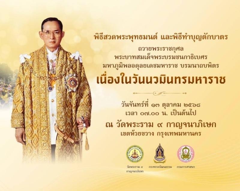 วธ. เตรียมจัดพิธีสวดพระพุทธมนต์และทำบุญตักบาตรถวายพระราชกุศลพระบาทสมเด็จ พระบรมชนกาธิเบศร มหาภูมิพลอดุลยเดชมหาราช บรมนาถบพิตร เนื่องในวันนวม [..]