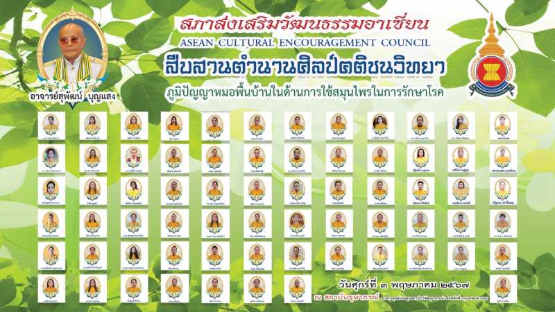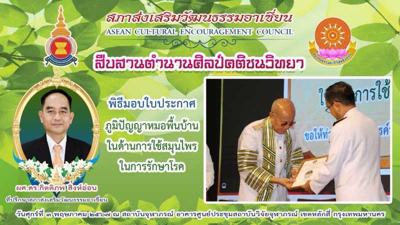 สภาส่งเสริมวัฒนธรรมอาเซียน จึงขอประกาศยกย่อง อาจารย์หมอสุพัฒน์ บุญแสง ผู้ที่มีความรู้ความสามารถทางด้านสมุนไพรไทยเป็นที่ประจักษ์ อีกทั้งยังเป็นผู้นำทักษะประสบการณ์ การจัดการความรู้ มาสร้างผลิตภัณฑ์และกระบวนการทำงานก่อให้เกิดคุณค่าในอาชีพและกิจการที่ยั่งยืน รวมถึงเผยแพร่ถ่ายทอดให้กับบุคคลรุ่นหลังได้ศึกษาเรียนรู้ต่อยอดต่อไป
