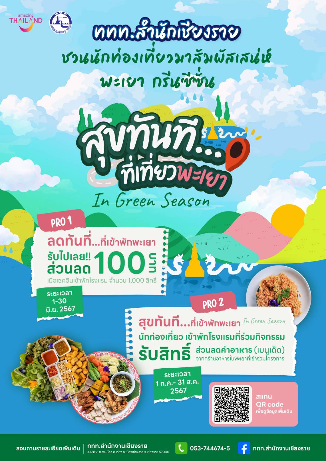 ททท.สำนักงานเชียงราย จับมือกับพันธมิตรภาคเอกชน และทุกภาคส่วนในจังหวัดเชียงราย พะเยา เปิดฤดูกาลท่องเที่ยวช่วง Green Season โดยเชิญชวนนักท่องเที่ยวมาท่องเที่ยวมาพักผ่อนเติมเต็มความสุขที่หลากหลาย และพักค้างในจังหวัดเชียงราย และพะเยา ภายใต้แคมเปญ “เที่ยวฉ่ำยามหน้าฝนที่เชียงราย” หรือ Amazing Chiang Rai in Green Season และแคมเปญ “สุขทันทีที่เที่ยวพะเยา In Green Season ในห้วงเดือนมิถุนายน-สิงหาคม 2567
