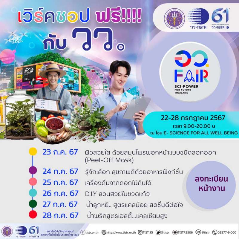 กระทรวงการอุดมศึกษา วิทยาศาสตร์ วิจัยและนวัตกรรม (อว.) โดย สถาบันวิจัยวิทยาศาสตร์และเทคโนโลยีแห่งประเทศไทย (วว.) จัดอบรมฟรี! ในงาน “อว.แฟร์ 2024” มหกรรมส่งเสริมการใช้ประโยชน์ อววน. เพื่อการพัฒนาเศรษฐกิจไทยอย่างยั่งยืน ด้วยพลังสหวิทยาการ (SCI POWER FOR FUTURE THAILAND ) ระหว่างวันที่ 22-28 กรกฎาคม 2567 เวลา 09.00-20.00 น. ณ ศูนย์การประชุมแห่งชาติ ดังนี้