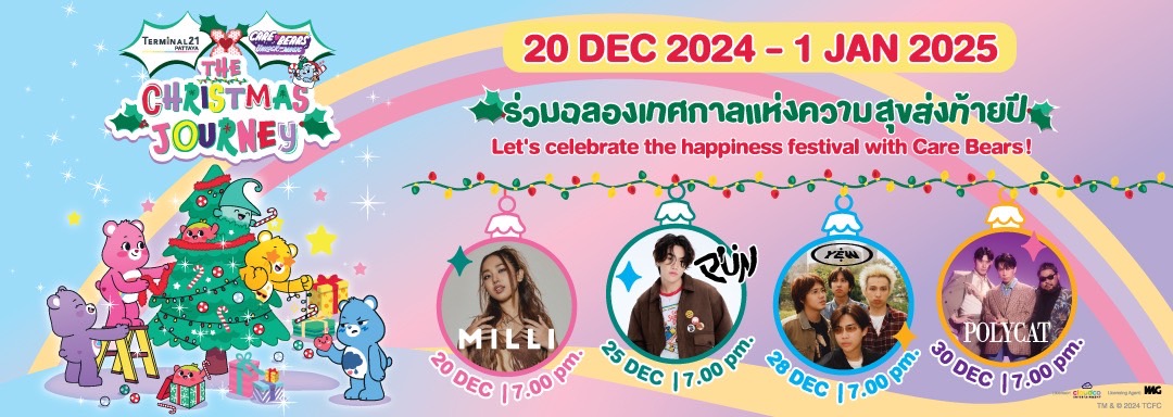 เริ่มที่ ศูนย์การค้าเทอร์มินอล21 พัทยา ครั้งแรกกับต้นคริสมาสต์แคร์แบร์สุดคิ้วท์ ที่ยกขบวนมาสร้างความสุขกับเทศกาลส่งท้ายปี 67 พบกับจุดไฮไลท์ที่ต้องไม่พลาดไปเช็คอินทั่วทั้งศูนย์การค้า สุดว้าวไปกับ Inflatable แคร์แบร์พองลมที่ใหญ่ที่สุดสูงกว่า 6 เมตร พร้อมกิจกรรมสุดหรรษา อาทิ Christmas Dance Party Special Santa dance parade และร่วม Meet & Greet นับถอยหลังเคาน์ดาวน์ไปกับเหล่าแก๊งค์แคร์แบร์ครั้งแรกในประเทศไทย ไม่ว่าจะเป็น Fun shine Bear Cheer Bear Love-a-lot Bear และอีกมากมาย ที่จะพาทุกคนร่วมผจญภัยความสนุกในช่วงคริสต์มาสและเฉลิมฉลองช่วงเวลาแห่งความสุขสิ้นปี ตลอดจนเตรียมพบกับบิ๊กเซอร์ไพร์สจากศูนย์การค้า ร่วมแจกของขวัญปีใหม่มากกว่า 2000 ชิ้น