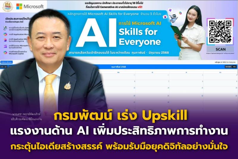 นายเดชา พฤกษ์พัฒนรักษ์ อธิบดีกรมพัฒนาฝีมือแรงงาน เปิดเผยว่า ตามนโยบายของนายพิพัฒน์ รัชกิจประการ รัฐมนตรีว่าการกระทรวงแรงงาน ที่เน้นทักษะทันสมัย โดยเฉพาะอย่างยิ่งทักษะด้านปัญญาประดิษฐ์ (AI) ให้แก่กำลังแรงงานของประเทศไทย กรมพัฒนาฝีมือแรงงานร่วมกับ บริษัท ไมโครซอฟท์ (ประเทศไทย) จำกัด จัดฝึกอบรมโครงการพัฒนาทักษะด้าน AI เพื่อแรงงานไทยทุกคน ขึ้น เป้าหมายทั้งสิ้น จำนวน 100,000 คน ทั่วประเทศ โดยเริ่มจากการพัฒนาบุคลากรและเจ้าหน้าที่ของกระทรวงแรงงาน ในหลักสูตรการใช้ Microsoft AI Skills for Everyone มีผู้ผ่านการฝึกอบรมแล้ว รวมทั้งสิ้น จำนวน 2,296 คน เนื่องจากเล็งเห็นว่า เจ้าหน้าที่ซึ่งเป็นบุคลากรที่ต้องรู้เท่าทันเทคโนโลยี เพื่อนำความรู้เหล่านั้นไปใช้ในการทำงานและอำนวยความสะดวก ช่วยเหลือพี่น้องแรงงาน และประชาชนที่มาใช้บริการได้อย่างรวดเร็ว และมีประสิทธิภาพ จึงต้องได้รับการพัฒนาทักษะด้วย นอกจากนี้กรมพัฒนาฝีมือแรงงานได้เปิดโอกาสให้แรงงานไทย นักศึกษา และประชาชนทั่วไป สามารถเข้าฝึกอบรมหลักสูตรการใช้ Microsoft AI Skills for Everyone ด้วยเช่นกัน สำหรับหลักสูตรดังกล่าว เป็นหลักสูตรจำนวน 3 ชั่วโมง ซึ่งจะทำให้ผู้เข้ารับการฝึกอบรมมีความรู้ความเข้าใจพื้นฐานเกี่ยวกับ AI เน้นทักษะทันสมัย และสามารถใช้เครื่องมือและโปรแกรมของ Microsoft ที่เกี่ยวข้องกับ AI ได้อย่างมีประสิทธิภาพ นำไปใช้งานจริงในชีวิตประจำวัน โดยจะได้รับความรู้ในหัวข้อต่าง ๆ เช่น ความรู้เบื้องต้นเกี่ยวกับ Generative AI และข้อควรปฏิบัติในการใช้ปัญญาประดิษฐ์ การใช้ Microsoft Copilot เพื่อช่วยงานเอกสารและสร้างเนื้อหาอย่างมืออาชีพ การใช้ Microsoft Designer ในการออกแบบและปรับแต่งรูปภาพให้น่าสนใจ การใช้ Microsoft Clipchamp สร้างสรรค์วิดีโอคุณภาพในไม่กี่ขั้นตอน การสร้างสรรค์เนื้อเพลงหรือคอนเทนต์ใหม่ ๆ ด้วย Microsoft Copilot โดยวิทยากรของกรมพัฒนาฝีมือแรงงานที่ได้รับการรับรองจากบริษัทไมโครซอฟท์ ประเทศไทย จำกัด และผู้ที่ผ่านการอบรมจะได้รับวุฒิบัตรร่วมจากกรมพัฒนาฝีมือแรงงาน และบริษัทไมโครซอฟท์ ประเทศไทย จำกัด อีกด้วย