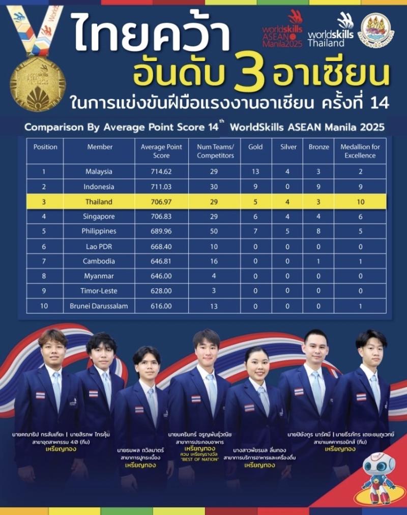 นายเดชา กล่าวต่อไปว่า การคว้าอันดับ 3 ในครั้งนี้ ถือเป็นความภาคภูมิใจของประเทศไทย เนื่องจากการแข่งขันมีความเข้มข้นสูง และเยาวชนไทยมีมาตรฐานทักษะฝีมือในระดับอาเซียนเพิ่มมากขึ้น ความสำเร็จในครั้งนี้สะท้อนถึงศักยภาพแรงงานไทยที่พร้อมพัฒนาและแข่งขันในระดับนานาชาติ โดยผลคะแนนรวมประเทศ (CIS) อย่างเป็นทางการ ประกอบด้วย 1) มาเลเซีย – 714.62 คะแนน (13 ทอง) 2) อินโดนีเซีย – 711.03 คะแนน (9 ทอง) 3) ไทย – 706.97 คะแนน (5 ทอง) 4) สิงคโปร์ – 706.83 คะแนน (6 ทอง) 5) ฟิลิปปินส์ – 689.96 คะแนน (7 ทอง) 6) ลาว – 668.40 คะแนน 7) กัมพูชา – 646.81 8) เมียนมา – 646 คะแนน 9) ติมอร์เลสเต – 628 คะแนน 10) บรูไน – 616 คะแนน
