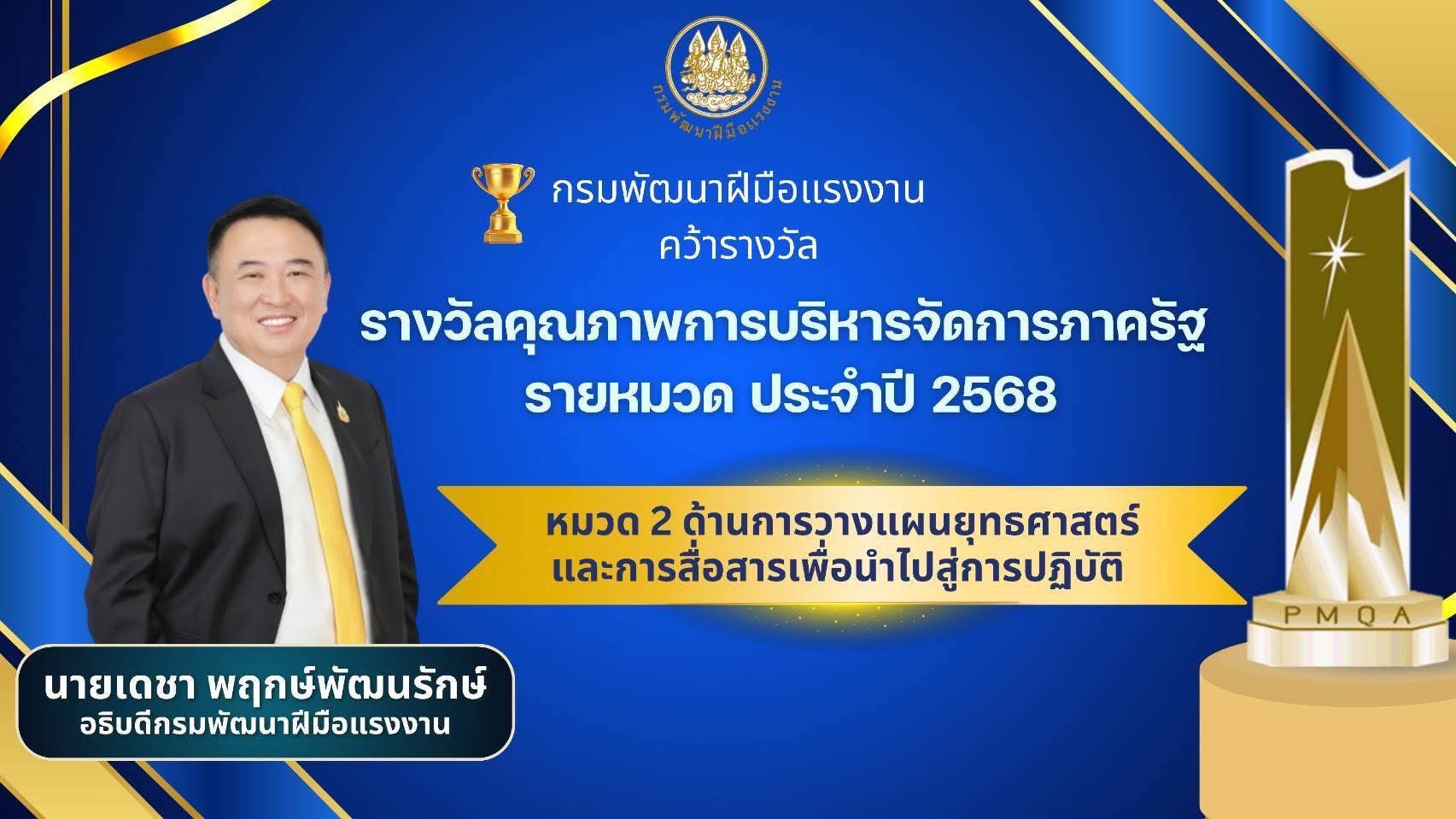 วันที่ 12 กันยายน 2568 นายเดชา พฤกษ์พัฒนรักษ์ อธิบดีกรมพัฒนาฝีมือแรงงาน พร้อมด้วยนางจิรวรรณ สุตสุนทร รองอธิบดีกรมพัฒนาฝีมือแรงงาน รับมอบโล่รางวัลเลิศรัฐ สาขาคุณภาพการบริหารจัดการภาครัฐ หมวด 2 ด้านการวางยุทธศาสตร์และการสื่อสารเพื่อนำไปสู่การปฏิบัติ ณ ห้องรอยัล จูบิลี่ บอลรูม อาคารชาเลนเจอร์ อิมแพ็คเมืองทองธานี จังหวัดนนทบุรี โดยมีศาสตราจารย์กิตติคุณ บวรศักดิ์ อุวรรณโณ เป็นประธานในพิธีและมอบรางวัล