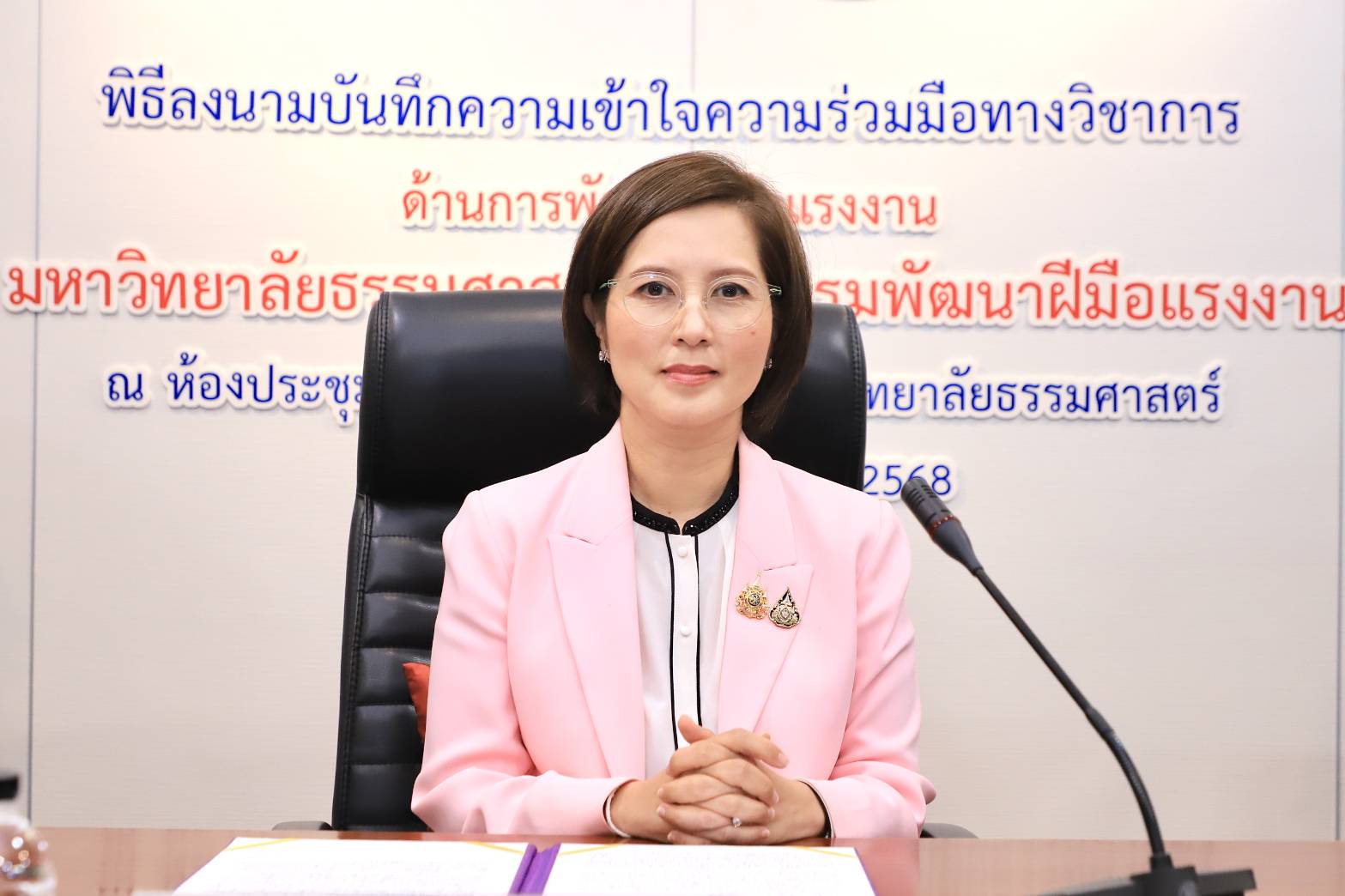 นางสาวตรีนุช เทียนทอง รัฐมนตรีว่าการกระทรวงแรงงาน เปิดเผยว่า รัฐบาลและกระทรวงแรงงานมีนโยบายส่งเสริมความร่วมมือในการผลิตกำลังคนในภาคการศึกษา และภาคแรงงาน เพื่อการมีงานทำรองรับเศรษฐกิจใหม่ รวมทั้งพัฒนาประเทศให้ก้าวไปข้างหน้าด้วยความมั่นคง ยั่งยืน และสังคมไทยมีความสุข คนไทยมีคุณภาพชีวิตที่ดีขึ้น ดำเนินการตามหลักปรัชญาของเศรษฐกิจพอเพียง โดยให้ความสำคัญกับการยกระดับคุณภาพแรงงานเพื่อให้แรงงานทั้งระบบมีโอกาสเข้าถึงการเรียนรู้และพัฒนาทักษะฝีมือในทุกระดับอย่างมีมาตรฐาน ส่งเสริมให้มีความรู้และทักษะในการประกอบอาชีพ เพื่อเป็นการสร้างโอกาสในการประกอบอาชีพ มีรายได้ มีงานทำ มีสวัสดิการ และเป็นทรัพยากรมนุษย์ที่มีคุณภาพต่อการพัฒนาสังคมและเศรษฐกิจของประเทศ การลงนามความร่วมมือในครั้งนี้ ถือว่ามีเป้าหมายและกลไกในการบูรณาการภารกิจร่วมกัน ระหว่าง กรมพัฒนาฝีมือแรงงาน กับ มหาวิทยาลัยธรรมศาสตร์ ซึ่งทั้งสองหน่วยงานจะร่วมกันจัดฝึกอบรมหลักสูตรฝึกอบรมฝีมือแรงงานให้สอดคล้องกับความต้องการของตลาดแรงงาน ทันต่อเทคโนโลยีสมัยใหม่ การพัฒนาฝีมือแรงงานเพื่อสะสมในระบบธนาคารหน่วยกิต (Credit Bank) โดยนำมาตรฐานฝีมือแรงงานแห่งชาติ และหลักสูตรการฝึกอบรมฝีมือแรงงาน มาเทียบโอนการเรียนรู้สู่ระบบธนาคารดังกล่าว เพื่อแรงงานจะได้วุฒิปริญญาตรี ซึ่งจะเปิดโอกาสให้คนที่ไม่ได้เรียนในระบบ แต่มีความรู้ ทักษะ และประสบการณ์จากการทำงาน การฝึกอบรม การทดสอบ หรือประสบการณ์ด้านอื่น ได้มีโอกาสนำไปใช้เพิ่มคุณวุฒิการศึกษาด้านวิชาชีพ ยกระดับคุณภาพชีวิตที่ดีขึ้น มีงานทำ และมีรายได้ที่สูงขึ้นต่อไป