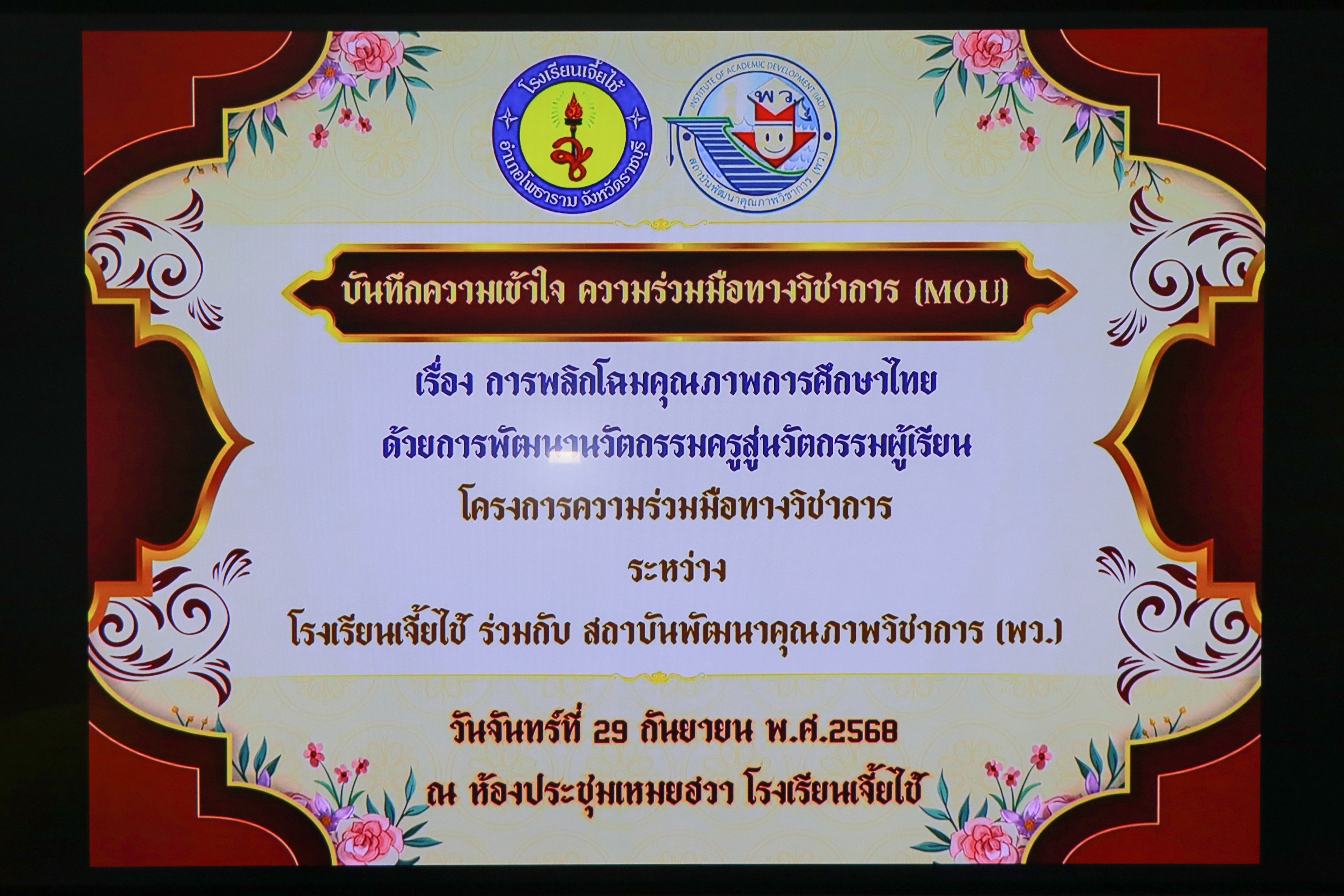 เมื่อวันจันทร์ที่ 29 กันยายน พ.ศ. 2568 เวลา 13.00 น. ณ ห้องประชุมโรงเรียนเจี้ยไช้ ได้จัดให้มีพิธีลงนามบันทึกความเข้าใจ ความร่วมมือทางวิชาการ (MOU) ระหว่างโรงเรียนเจี้ยไช้กับสถาบันพัฒนาคุณภาพวิชาการ (พว.) โดยมี นายธีระ อารักษ์วิชานันท์ ผู้รับใบอนุญาตโรงเรียนเจี้ยไช้ กับ ดร.ศักดิ์สิน โรจน์สราญรมย์ ประธานกรรมการบริหารสถาบันพัฒนาคุณภาพวิชาการ (พว.) ร่วมลงนาม
