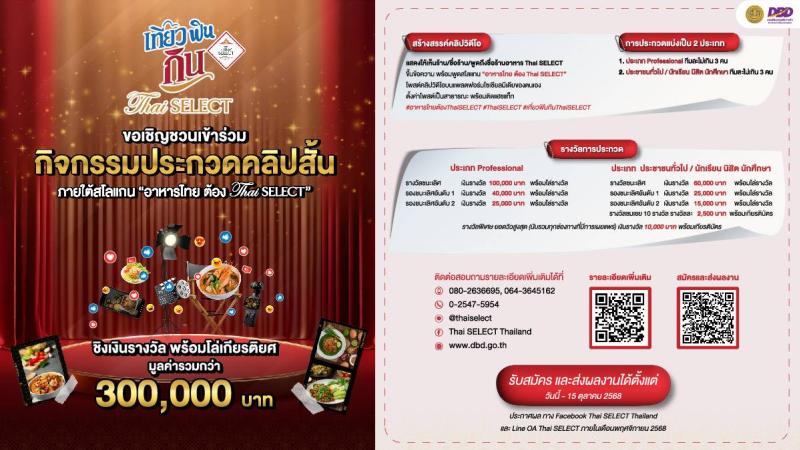 2 ประเภท ได้แก่ 1) ประเภท Professional ทีมละไม่เกิน 3 คน จำนวน 3 รางวัล โดยมีรางวัลชนะเลิศมูลค่า 100,000 บาท รางวัลที่ 2 มูลค่า 40,000 บาท และรางวัลที่ 3 มูลค่า 25,000 บาท และ 2) ประเภทประชาชนทั่วไป นักเรียน นิสิต นักศึกษา ทีมละไม่เกิน 3 คน จำนวน 13 รางวัล รางวัลชนะเลิศมูลค่า 60,000 บาท รางวัลที่ 2 มูลค่า 25,000 บาท รางวัลที่ 3 มูลค่า 15,000 บาท และรางวัลชมเชย 10 รางวัล รางวัลละ 2,500 บาท นอกจากนี้ ยังมีรางวัลพิเศษสำหรับคลิปที่มียอดวิวสูงสุดจากทุกแพลตฟอร์มมูลค่า 10,000 บาท พร้อมเกียรติบัตรจำนวน 1 รางวัล ผู้สนใจสามารถสมัครและส่งผลงานผ่านทาง https://thaiselect.my.canva.site/ ได้ตั้งแต่วันนี้ไปจนถึงวันที่ 15 ตุลาคม 2568 ติดตามรายละเอียดเพิ่มเติมได้ที่ Facebook: Thai SELECT Thailand และ LINE Official Account: @thaiselect