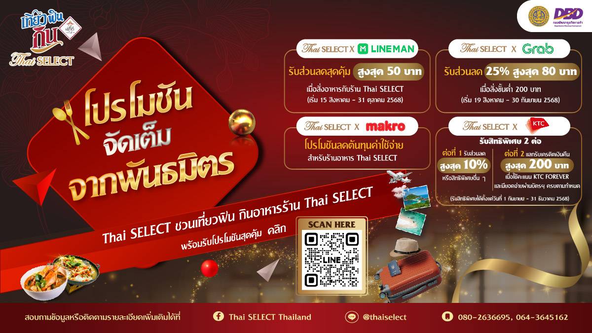 กรมพัฒนาธุรกิจการค้า เดินหน้ายกระดับมาตรฐานและสร้างโอกาสทางการตลาดให้แก่ธุรกิจร้านอาหารไทยที่ได้รับตราสัญลักษณ์ Thai SELECT อย่างต่อเนื่อง โดยได้จัดกิจกรรมส่งเสริมการตลาดภายใต้แคมเปญ ‘เที่ยว ฟิน กิน Thai SELECT ปี 2’ ด้วยการมอบสิทธิพิเศษมากมายจากพันธมิตร ทั้งคูปองส่วนลดค่าอาหาร/โค้ดพิเศษในแพลตฟอร์มฟู้ดเดลิเวอรี LINE MAN และ Grab สิทธิประโยชน์เมื่อใช้จ่ายด้วยบัตรเครดิตกรุงไทย (KTC) ในร้าน Thai SELECT และ Makro มอบโปรโมชันลดต้นทุนค่าใช้จ่ายร้าน Thai SELECT