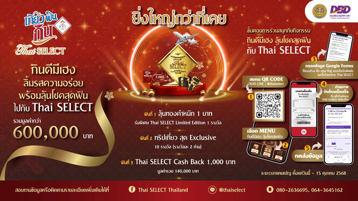 Thai SELECT ทั่วประเทศ กับกิจกรรม ‘กินดีมีเฮง’ ลิ้มรสความอร่อยพร้อมลุ้นโชคสุดฟินคูณสาม รวมมูลค่ากว่า 600,000 บาท ได้แก่ ฟินที่ 1 ลุ้นทองคำหนัก 1 บาท ซึ่งเป็นรุ่นพิเศษ Thai SELECT Limited Edition ฟินที่ 2 ทริปท่องเที่ยวสุดเอ็กซ์คลูซีฟตามรอยร้าน Thai SELECT และ ฟินที่ 3 Thai SELECT Cash Back รับสิทธิ์ลุ้น Cash Back รวมมูลค่ากว่า 140,000 บาท เพียงรับประทานอาหารที่ร้าน Thai SELECT ครบ 500 บาทขึ้นไป และส่งภาพใบเสร็จ พร้อมกรอกรายละเอียดตามแบบฟอร์มที่ LINE Official Account: @thaiselect โดยใบเสร็จ 1 ใบ ลุ้นโชคได้ 1 สิทธิ์ สามารถส่งใบเสร็จร่วมกิจกรรมได้ไม่จำกัดจำนวนครั้ง ตั้งแต่วันนี้ ไปจนถึงวันที่ 15 ตุลาคม 2568