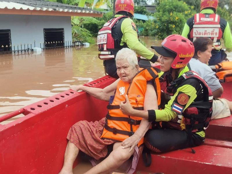 ทีมบรรเทาสาธารณภัย นำกำลังเจ้าหน้าที่กู้ชีพกู้ภัยเคลื่อนย้ายคุณยายซึ่งเป็นผู้ป่วยติดเตียงมาไว้ในพื้นที่ปลอดภัย
