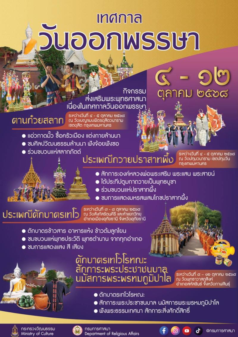 มาช้านาน เพื่อส่งเสริมการท่องเที่ยวในมิติศาสนาและวัฒนธรรม กรมการศาสนา กระทรวงวัฒนธรรม ขอเชิญชวนประชาชนร่วมสัมผัสบรรยากาศงานบุญและความงดงามศรัทธาแห่งธรรม ผ่าน “10 จุดเช็คอินวันออกพรรษาทั่วไทย” ที่เปี่ยมด้วยสีสันและความหมายทางวัฒนธรรม ซึ่งไม่เพียงสะท้อนถึงขนบธรรมเนียมประเพณีอันดีงาม แต่ยังช่วยสืบสานพระพุทธศาสนาและสร้างความภาคภูมิใจในรากเหง้าวัฒนธรรมไทย ดังนี้ 1. “ประเพณีแห่ปราสาทผึ้งและแข่งขันเรือยาว ชิงถ้วยพระราชทานฯ จังหวัดสกลนคร” ระหว่างวันที่ 1 - 7 ตุลาคม 2568 ไฮไลต์ของงานคือขบวนแห่ปราสาทผึ้งอันวิจิตรตระการตา พร้อมการแข่งขันเรือยาวสุดตื่นเต้นริมหนองหาร สะท้อนถึงความสามัคคีและศรัทธาของชาวสกลนคร 2. “ประเพณีออกพรรษา และบั้งไฟพญานาคโลก จังหวัดหนองคาย” ระหว่างวันที่ 4 - 8 ตุลาคม 2568 ปรากฏการณ์อัศจรรย์ริมฝั่งโขง บั้งไฟพญานาคพวยพุ่งจากแม่น้ำโขงในคืนวันเพ็ญเดือน 11 ดึงดูดนักท่องเที่ยวจำนวนมาก พร้อมกิจกรรมบุญและการละเล่นพื้นบ้านที่คึกคัก 3. “ประเพณีไหลเรือไฟและงานกาชาด จังหวัดนครพนม” ระหว่างวันที่ 27 กันยายน - 8 ตุลาคม 2568 เรือไฟขนาดใหญ่ประดับดวงไฟสว่างไสวล่องกลางลำน้ำโขง สร้างทัศนียภาพอันงดงาม ถือเป็นงานบุญที่แสดงออกถึงแรงศรัทธาและภูมิปัญญาของชาวนครพนม 4. “ประเพณีออกพรรษา เชียงคาน จังหวัดเลย” ระหว่างวันที่ 30 กันยายน - 8 ตุลาคม 2568 การสร้าง “ผาสาด” หรือปราสาทกระดาษ เพื่อลอยน้ำเป็นการสะเดาะเคราะห์และอุทิศส่วนกุศลแก่ผู้ล่วงลับ เป็นประเพณีที่ผสมผสานความเชื่อกับศิลปวัฒนธรรมท้องถิ่นอย่างงดงาม 5. “ประเพณีบุญกระธูป จังหวัดชัยภูมิ” ระหว่างวันที่ 3 - 6 ตุลาคม 2568 ชาวบ้านร่วมกันทำ “กระธูป” หรือกระทงขนาดใหญ่ประดับอย่างวิจิตร เพื่อถวายเป็นพุทธบูชาและแสดงออกถึงความกตัญญูต่อบรรพบุรุษ เป็นงานบุญที่โดดเด่น ทรงคุณค่าและหาชมได้เพียงแห่งเดียว 6. “ประเพณีรับบัว จังหวัดสมุทรปราการ” ระหว่างวันที่ 30 กันยายน - 8 ตุลาคม 2568 ประเพณีเก่าแก่ของชาวบางพลีที่ชาวบ้านจะโยนดอกบัวลงสู่ขบวนเรือหลวงพ่อโตอันศักดิ์สิทธิ์ สร้างบรรยากาศที่เต็มไปด้วยความศรัทธาแห่งธรรมและความร่วมมือของคนทั้งชุมชน 7. “ประเพณีตักบาตรเทโวโรหณะมหัศจรรย์ข้าวต้มลูกโยน จังหวัดสระบุรี” ระหว่างวันที่ 7 - 8 ตุลาคม 2568 งานบุญที่เป็นเอกลักษณ์เฉพาะ โดยชาวบ้านถวาย “ข้าวต้มลูกโยน” แด่พระสงฆ์ เป็นประเพณีที่สะท้อนถึงความศรัทธาและภูมิปัญญาท้องถิ่น 8. “ประเพณีตักบาตรเทโว จังหวัดอุทัยธานี” ระหว่างวันที่ 7 - 8 ตุลาคม 2568 พระสงฆ์นับร้อยรูปเดินบิณฑบาตลงจากบันไดเขาสะแกกรัง ปร