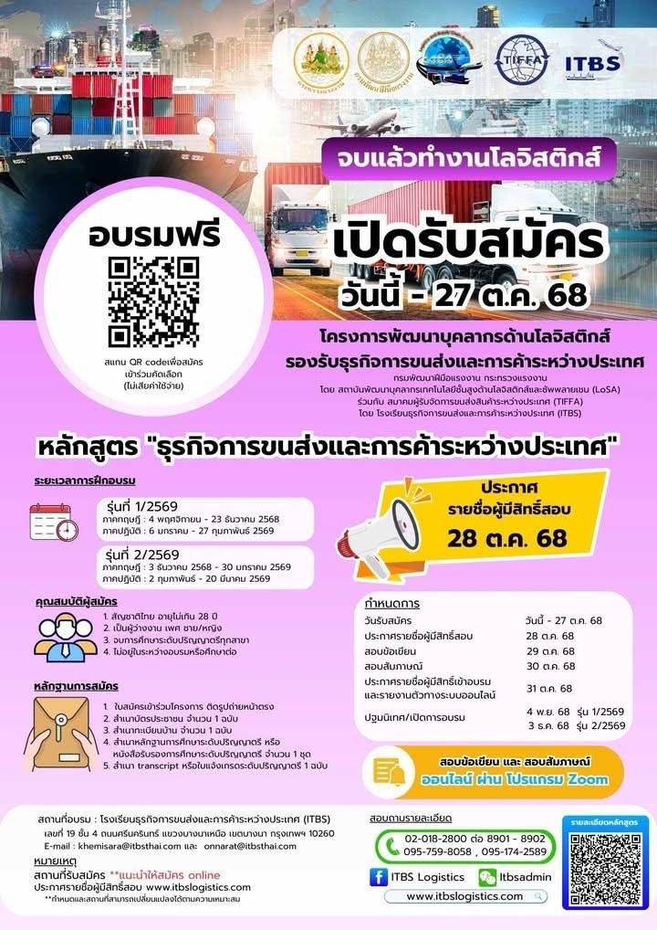 กรมพัฒนาฝีมือแรงงาน โดยสถาบันพัฒนาบุคลากรเทคโนโลยีชั้นสูงด้านโลจิสติกส์และซัพพลายเชน (LoSA) ร่วมกับสมาคมผู้รับจัดการขนส่งสินค้าระหว่างประเทศ (TIFFA) โดยโรงเรียนธุรกิจการขนส่งและการค้าระหว่างประเทศ (ITBS) เปิดรับสมัครผู้สนใจเข้าร่วมอบรม หลักสูตรธุรกิจการขนส่งและการค้าระหว่างประเทศ ภายใต้โครงการพัฒนาบุคลากรด้านโลจิสติกส์รองรับธุรกิจขนส่งและการค้าระหว่างประเทศ ระยะเวลา 240 ชั่วโมง ตั้งแต่บัดนี้ ถึง 27 ตุลาคม 2568 อบรมฟรี ได้ทำงานจริง