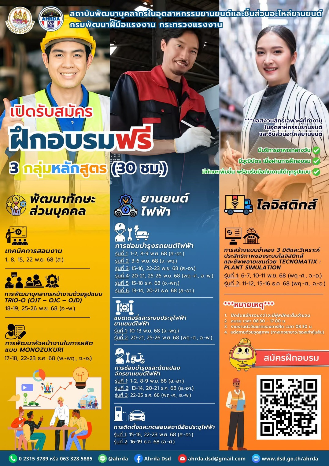 นายภัทรวุธ กล่าวต่อไปว่า ปี 2569 กรมพัฒนาฝีมือแรงงาน ตั้งเป้าฝึกอบรมในด้านดังกล่าว 15,000 คน ซึ่งขณะนี้ สถาบันพัฒนาบุคลากรในอุตสาหกรรมยานยนต์และชิ้นส่วนอะไหล่ยานยนต์ (AHRDA) จ.สมุทรปราการ จะเปิดฝึกอบรมระหว่างเดือนตุลาคม จนถึงธันวาคม 2568 จำนวน 3 กลุ่มหลักสูตร 13 รุ่น ประกอบด้วย 1) กลุ่มพัฒนาทักษะส่วนบุคคล ได้แก่ หลักสูตรเทคนิคการสอนงาน หลักสูตร การพัฒนาบุคลากรหน้างานด้วยรูปแบบ Trio-O หลักสูตร การพัฒนาหัวหน้างานการผลิตแบบ Monozukuri 2) กลุ่มยานยนต์ไฟฟ้า ได้แก่ หลักสูตรการซ่อมบำรุงรถยนต์ไฟฟ้า หลักสูตรแบตเตอรี่และระบบประจุไฟฟ้ายานยนต์ไฟฟ้า หลักสูตรการซ่อมบำรุงและดัดแปลงจักรยานยนต์ไฟฟ้า หลักสูตรการติดตั้งและทดสอบสถานีอัดประจุไฟฟ้า 3) กลุ่มโลจิสติกส์ ได้แก่ หลักสูตรการสร้างแบบจำลองสามมิติและวิเคราะห์ประสิทธิภาพของระบบโลจิสติกส์และซัพพลายเชนด้วย Tecnomatrix plant simulation คุณสมบัติของผู้สมัครต้องเป็นผู้ที่ทำงานเกี่ยวข้องกับด้านอุตสาหกรรมยานยนต์และชิ้นส่วนอะไหล่ยานยนต์ สุขภาพแข็งแรง มีความพร้อมสำหรับการเรียนรู้ตลอดหลักสูตร ทั้งนี้ อบรมฟรี ไม่มีค่าใช้จ่าย มีอาหารกลางวันฟรีให้สำหรับผู้เข้าอบรม และเมื่อผ่านการฝึกอบรมจะได้รับวุฒิบัตรด้วย สามารถสมัครได้ที่ สถาบันพัฒนาบุคลากรในอุตสาหกรรมยานยนต์และชิ้นส่วนอะไหล่ยานยนต์ (AHRDA) โทร. 0 2315 3789 , 06 3328 5885 Line : @ahrda หรือ https://ahrda-recruit.my.canva.site/ หรือสแกน QR Code จากภาพด้านล่างได้เช่นกัน