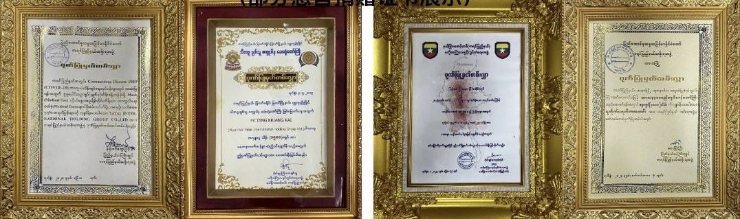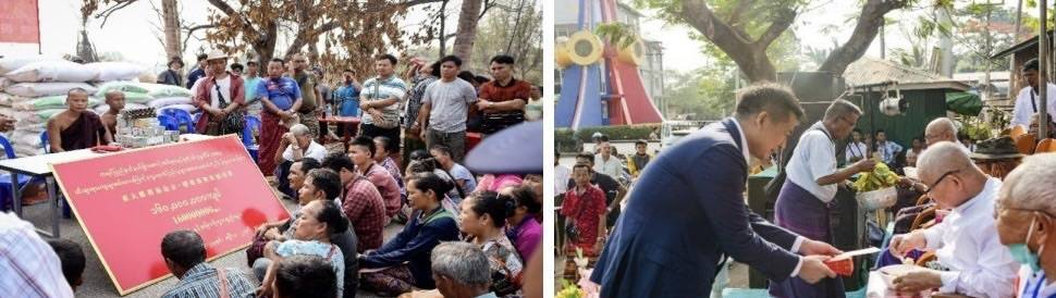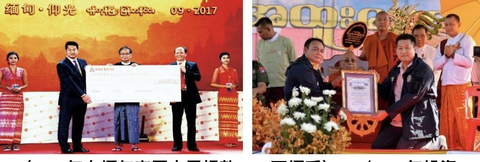 ภาพซ้าย: ปีพ.ศ. 2560 บริจาคเงินช่วยเหลือประชาชนในเขตภัยพิบัติประเทศเมียนมาร์เป็นจำนวน 20,000,000 จ๊าดเมียนมาร์