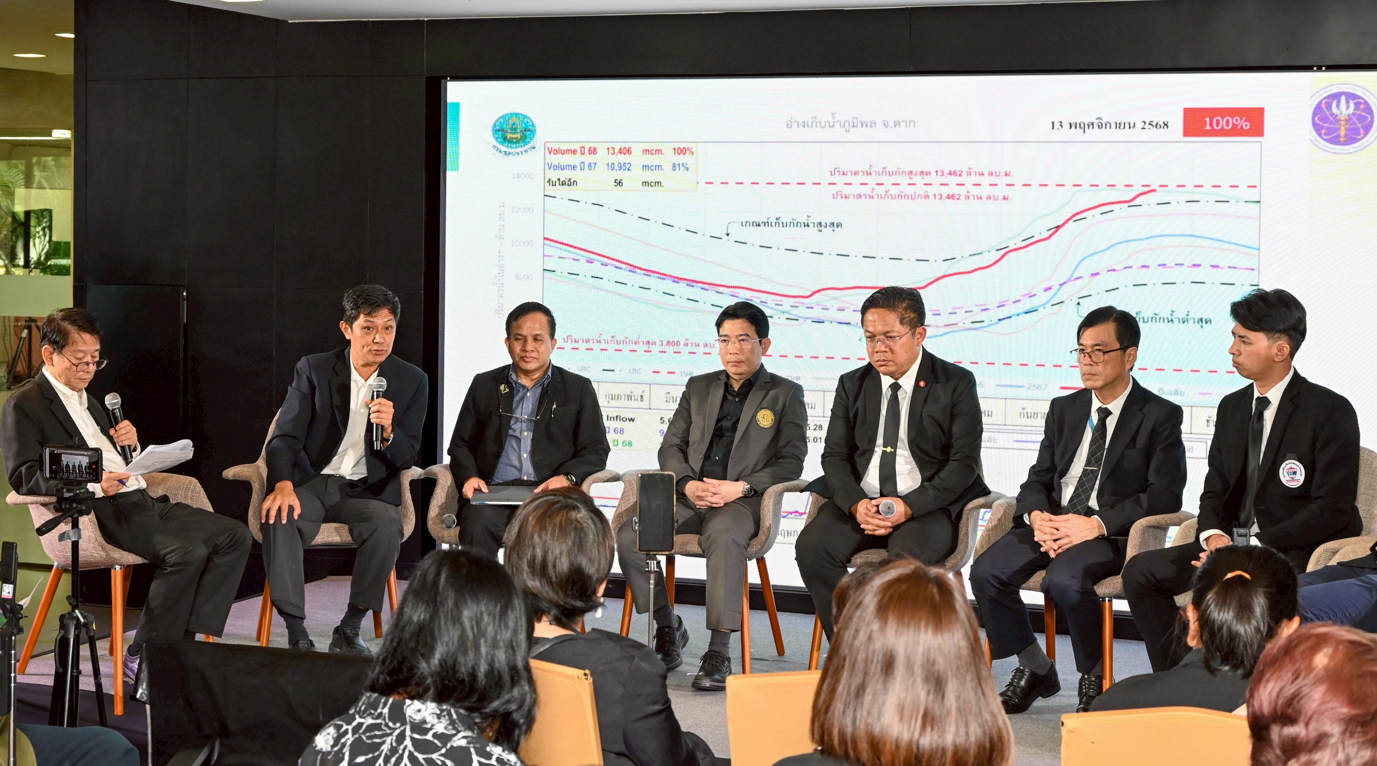 - ดร.ธเนศร์ สมบูรณ์ กรมชลประทาน กล่าวถึงการบริหารจัดการน้ำช่วงปลายฤดูฝนของกรมชลประทาน เพื่อให้เป็นที่แน่ใจว่าประชาชนจะมีน้ำเพียงพอในช่วงฤดูแล้ง ช่วงต้นเดือน พย. เขื่อนจะเก็บน้ำไว้ประมาณร้อยละ 80 ของความจุและมีการปรับตามสถานการณ์รายเดือน สถานการณ์ครั้งนี้ปริมาณน้ำส่วนใหญ่มาจากแม่น้ำปิง ซึ่งทำให้เขื่อนภูมิพลมีปริมาณน้ำเต็มความจุ โจทย์สำคัญคือในเดือน พฤษภาคม 2569 จะบริหารการพร่องน้ำของเขื่อนในฤดูฝนอย่างไร เพื่อให้เป็นเครื่องมือกับความแปรปรวนของอากาศที่เกิดขึ้น