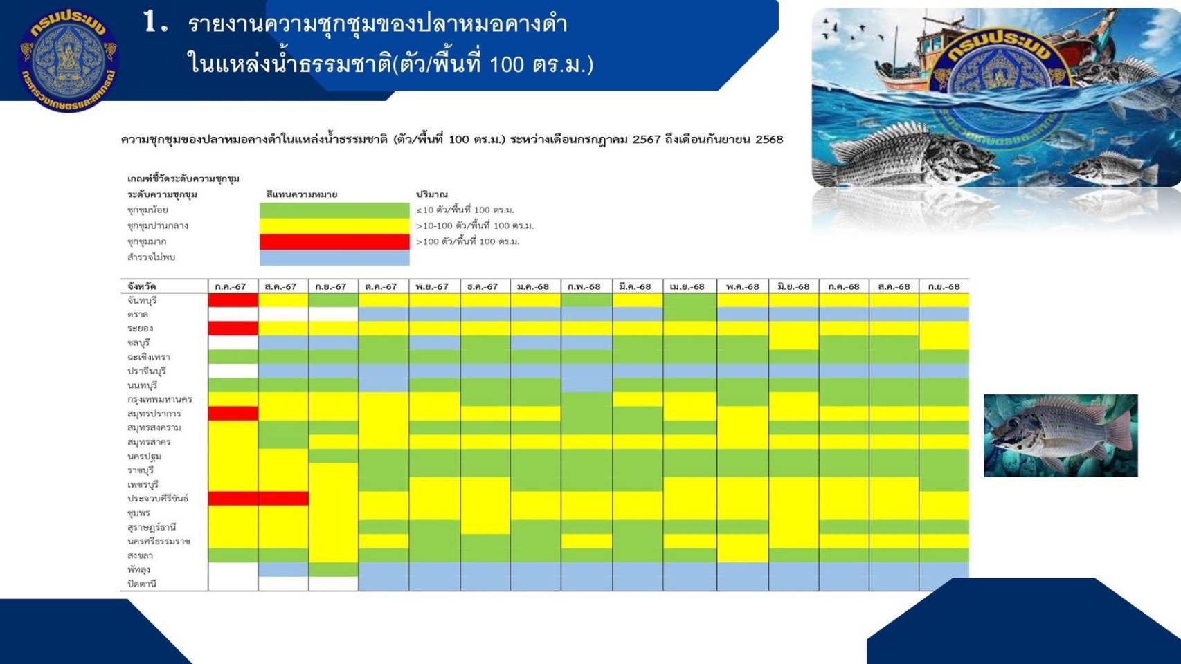 สำหรับสถานการณ์การแพร่ระบาด ระหว่างเดือนกรกฎาคม 2567 – เดือนกันยายน 2568 พบปลาหมอคางดำ ในระดับความชุกชุมน้อย มีค่าเฉลี่ย 10 ตัวต่อ 100 ตารางเมตร จำนวน 9 จังหวัด ในระดับความชุกชุมปานกลาง มีค่าเฉลี่ย 10-100 ตัวต่อ 100 ตาราง จำนวน 7 จังหวัด และสำรวจไม่พบปลาหมอคางดำ 4 จังหวัด ซึ่งจากข้อมูลทางสถิติที่กรมประมงเก็บรวบรวมมา บ่งชี้ได้ว่า สถานการณ์การแพร่ระบาดของปลาหมอคางดำเริ่มอยู่ในทิศทางที่ดีขึ้นในทุกจังหวัด