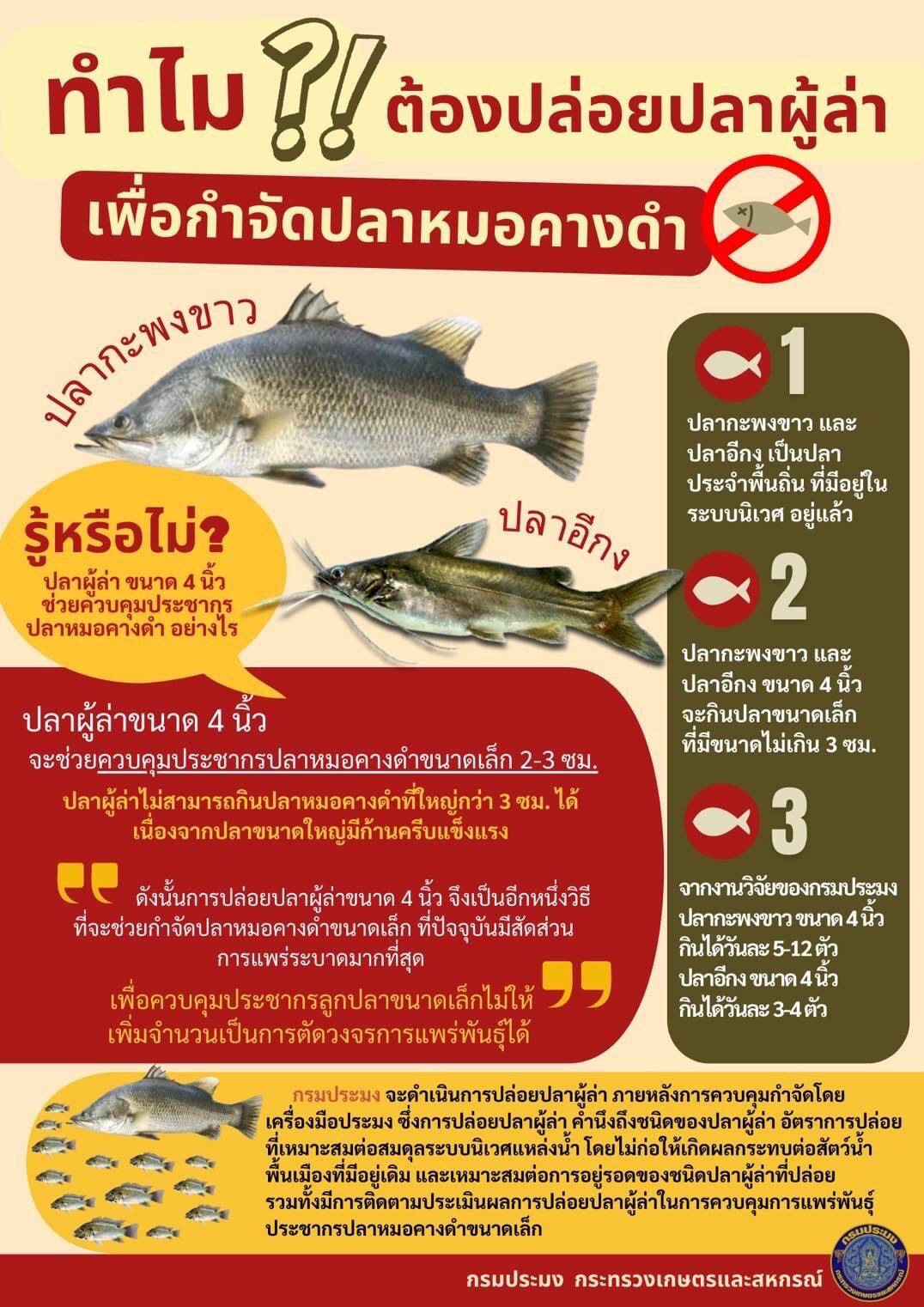 ปีงบประมาณ 2569 ได้รับสนับสนุนพันธุ์ปลากะพงขาวจากเอกชน ขนาด 4 - 5 นิ้ว จำนวน 25,000 ตัว คงเหลือส่งมอบ 391,000 ตัว จากแผนฯ ทั้งหมด 416,000 ตัว ปล่อยปลาผู้ล่าในพื้นที่ที่มีการกำจัดอย่างต่อเนื่อง และมีความชุกชุมลดลงโดยจัดสรรให้พันธุ์ปลามีความหลากหลายมากขึ้นเช่น ปลาอีกง ปลากดคัง ปลาช่อน ปลากะพงขาว โดยใช้งบปกติของกรมประมง