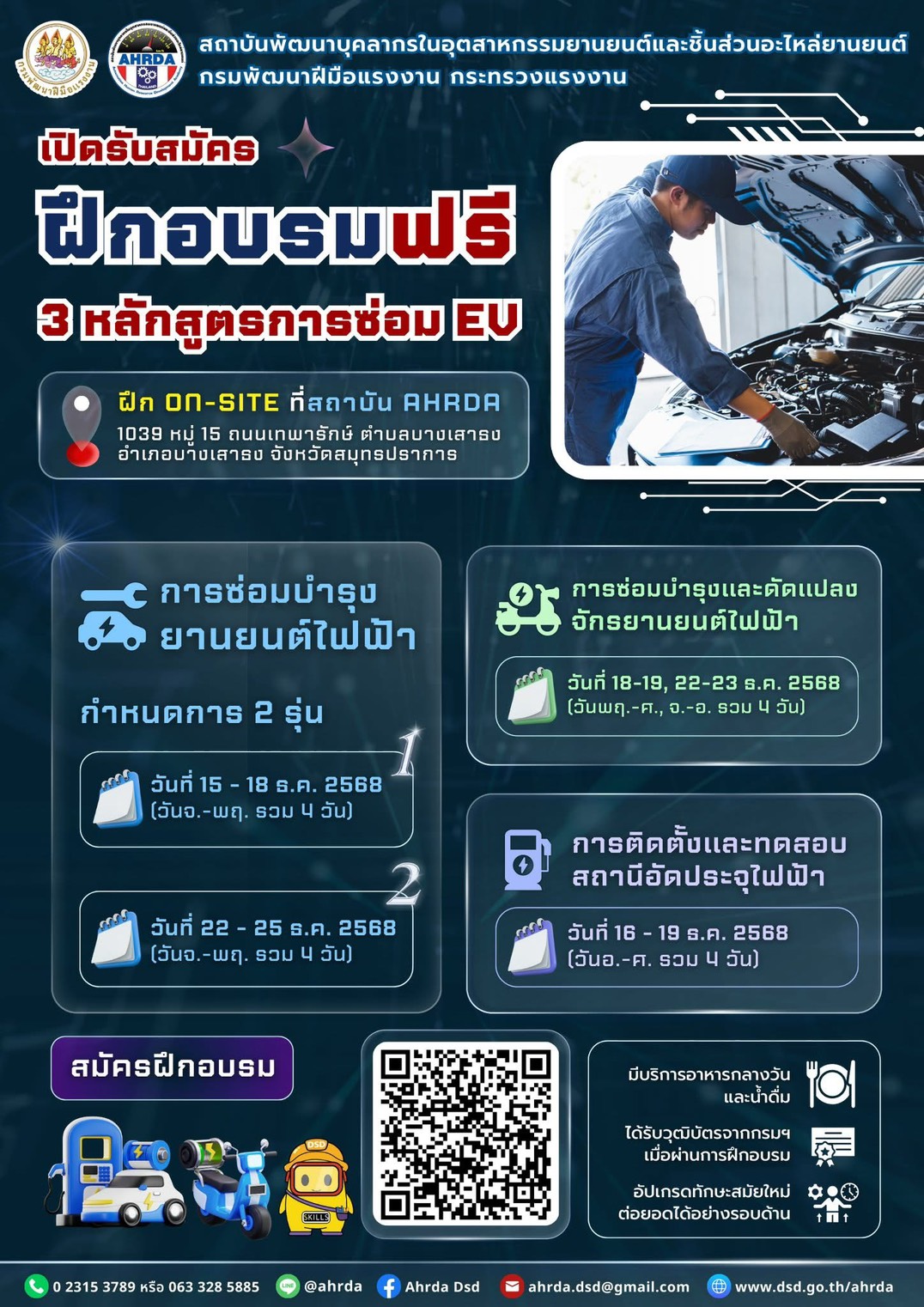 นายสมาสภ์ ปัทมะสุคนธ์ อธิบดีกรมพัฒนาฝีมือแรงงาน เปิดเผยว่า “ปัญหาใหญ่ของแรงงานไทย คือ ความสามารถและทักษะไปไม่ถึงตลาดแรงงาน เนื่องจากขาดทักษะในเรื่องเทคโนโลยีใหม่ ๆ และอุตสาหกรรมแห่งอนาคต การ Up Skill / Re-Skill ให้แรงงานไทยก้าวทันเทคโนโลยี ด้วยการพัฒนาทักษะทางดิจิทัล ให้ตอบโจทย์ตลาดแรงงานในอนาคต จึงเป็นหนึ่งใน 5 นโยบายหลักของรัฐมนตรีว่าการกระทรวงแรงงาน หลักสูตรหลัก ๆ ที่มอบเป็นนโยบายเร่งด่วน คือ การพัฒนาสมรรถนะบุคลากรรองรับการขยายตัวของอุตสาหกรรมยานยนต์สมัยใหม่ ที่มุ่งเน้นความยั่งยืนและความชาญฉลาด อาทิ รถยนต์ไฟฟ้า (EV), รถยนต์ขับขี่อัตโนมัติ, รถยนต์เชื่อมต่ออัจฉริยะ (Connected Car) สอดคล้องกับความต้องการ จากกำลังแรงงานและสถานประกอบกิจการในอุตสาหกรรมยานยนต์ ที่ต้องการให้กรมพัฒนาฝีมือแรงงาน เร่งพัฒนาทักษะฝีมือและผลิตแรงงานด้านยานยนต์ไฟฟ้า (EV) ป้อนสู่อุตสาหกรรม ซึ่งปัจจัยเรียกร้องเกิดขึ้นจากที่ประชาชนเริ่มให้ความสนใจรถยนต์ไฟฟ้าและจักรยานยนต์ไฟฟ้ามากขึ้นเรื่อย ๆ ทำให้ความต้องการแรงงานสูงตามไปด้วย จึงมอบหมายให้สถาบันพัฒนาบุคลากรในอุตสาหกรรมยานยนต์และชิ้นส่วนอะไหล่ยานยนต์ (AHRDA) หน่วยงานที่มีภารกิจพัฒนาทักษะแรงงานในสาขานี้ จัดฝึกหลักสูตรต่าง ๆ ที่เกี่ยวข้อง ล่าสุดเปิดอบรมอีก 3 หลักสูตร ได้แก่ หลักสูตรการซ่อมบำรุงรถยนต์ไฟฟ้า จำนวน 2 รุ่น รุ่นที่ 1 อบรมระหว่างวันที่ 15-18 ธ.ค. 68 รุ่นที่ 2 อบรมระหว่างวันที่ 22-25 ธ.ค. 68 หลักสูตรการซ่อมบำรุงและดัดแปลงจักรยานยนต์ไฟฟ้า อบรมระหว่างวันที่ 18-19 และ 22-23 ธ.ค. 68 หลักสูตรการติดตั้งและทดสอบสถานีอัดประจุไฟฟ้า อบรมระหว่างวันที่ 16-19 ธ.ค. 68 อบรมที่สถาบันพัฒนาบุคลากรในอุตสาหกรรมยานยนต์และชิ้นส่วนอะไหล่ยานยนต์ ถ.เทพารักษ์ ต.บางเสาธง อ.บางเสาธง จ.สมุทรปราการ