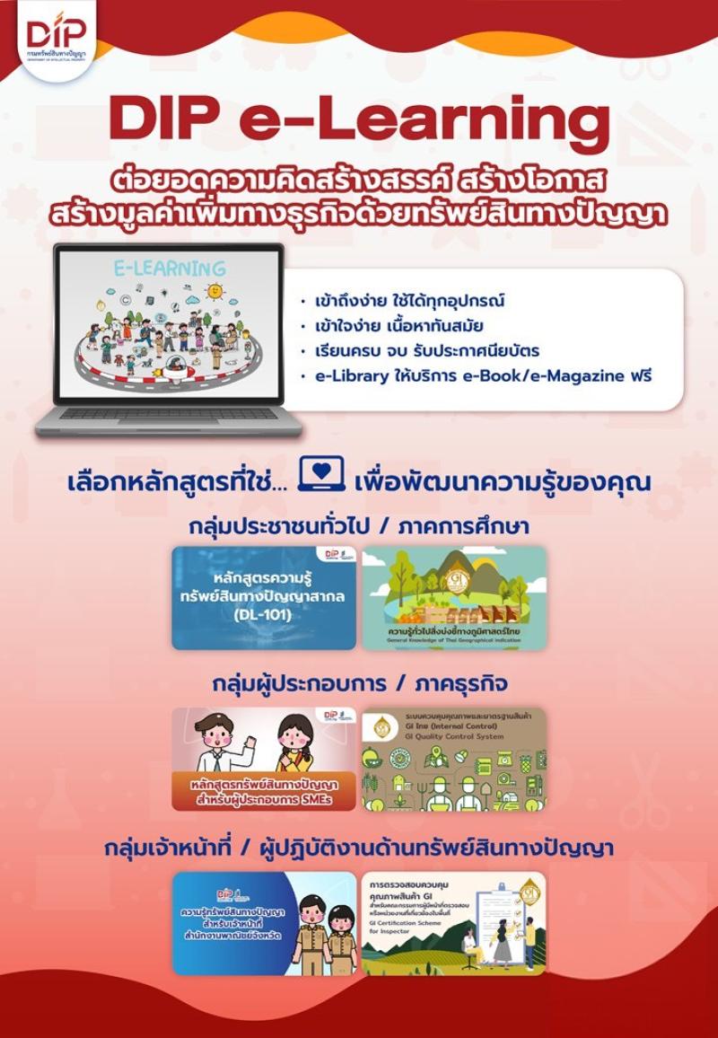 ด้านทรัพย์สินทางปัญญาให้มีความน่าสนใจและตอบโจทย์ผู้ใช้งานยิ่งขึ้น ภายใต้ระบบ e-Learning โฉมใหม่ กรมได้ปรับปรุงหลักสูตรเดิมและพัฒนาหลักสูตรใหม่ให้ตอบโจทย์ทุกความต้องการ โดยปลายปี 2568 นี้ เตรียมพบกับ 6 หลักสูตร สำหรับ 3 กลุ่มเป้าหมาย ที่จะเปิดตัวในระยะแรก ประกอบด้วย กลุ่มที่ 1 หลักสูตรสำหรับภาคการศึกษาและประชาชนทั่วไป 2 หลักสูตร ได้แก่ หลักสูตรพื้นฐานความรู้ทรัพย์สินทางปัญญาขององค์การทรัพย์สินทางปัญญาโลก (DL-101) และหลักสูตรความรู้ทั่วไปเรื่องสิ่งบ่งชี้ทางภูมิศาสตร์ (GI) กลุ่มที่ 2 หลักสูตรสำหรับภาคธุรกิจ 2 หลักสูตร ได้แก่ หลักสูตรทรัพย์สินทางปัญญาสำหรับผู้ประกอบการ SMEs และหลักสูตรระบบควบคุมคุณภาพและมาตรฐานสินค้า GI ไทย (Internal Control) และกลุ่มที่ 3 หลักสูตรสำหรับเจ้าหน้าที่ผู้ปฏิบัติงานด้านทรัพย์สินทางปัญญา 2 หลักสูตร ได้แก่ หลักสูตรความรู้ทรัพย์สินทางปัญญาสำหรับเจ้าหน้าที่สำนักงานพาณิชย์จังหวัด และหลักสูตรการตรวจสอบควบคุมคุณภาพสินค้า GI สำหรับผู้ทำหน้าที่ตรวจสอบในพื้นที่