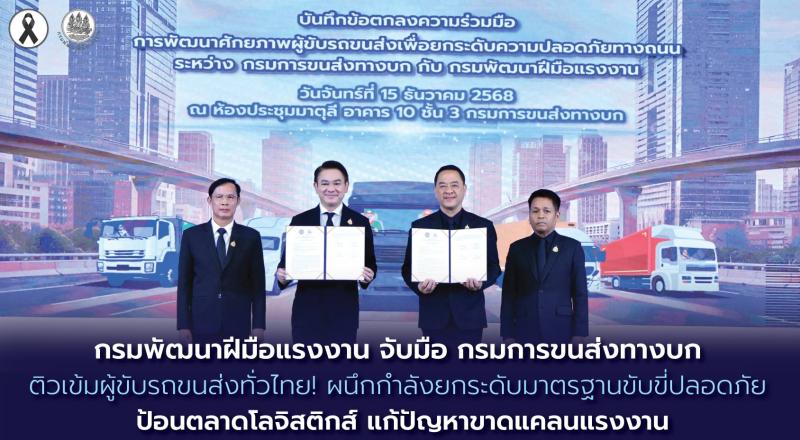 วันที่ 15 ธันวาคม 2568 นายสมาสภ์ ปัทมะสุคนธ์ อธิบดีกรมพัฒนาฝีมือแรงงาน พร้อมด้วย นายสรพงศ์ ไพฑูรย์พงษ์ อธิบดีกรมการขนส่งทางบก เป็นประธานร่วมในพิธีลงนามบันทึกข้อตกลงความร่วมมือ (MOU) ระหว่างกรมพัฒนาฝีมือแรงงาน กับ กรมการขนส่งทางบก เพื่อยกระดับความปลอดภัยทางถนน พัฒนาศักยภาพผู้ขับรถขนส่ง ป้อนระบบโลจิสติกส์ไทยให้เข้มแข็งได้มาตรฐานสากล โดยมี นายภัทรวุธ เภอแสละ รองอธิบดีกรมพัฒนาฝีมือแรงงาน นายชีพ น้อมเศียรพร้อม รองอธิบดีกรมการขนส่งทางบก ร่วมเป็นสักขีพยาน ผู้บริหารกรมพัฒนาฝีมือแรงงาน ภาคีเครือข่ายทั้งภาครัฐและเอกชน สหพันธ์การขนส่งทางบกแห่งประเทศไทย และผู้ประกอบการขนส่ง ร่วมเป็นเกียรติ ณ ห้องประชุมมาตุลี อาคาร 10 ชั้น 3 กรมการขนส่งทางบก เขตจตุจักร กรุงเทพมหานคร
