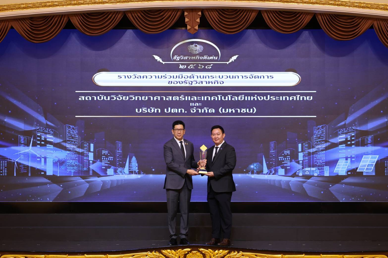 ดร.เอกนิติ นิติทัณฑ์ประภาศ รองนายกรัฐมนตรีและรัฐมนตรีว่าการกระทรวงการคลัง ประธานในพิธีมอบรางวัลรัฐวิสาหกิจดีเด่น ประจำปี 25658 ภายใต้แนวคิด รัฐวิสาหกิจขับเคลื่อนสังคมไทย มุ่งผลลัพธ์สู่ความยั่งยืน (Driving Society, Delivering Sustainability) จัดโดย สำนักงานคณะกรรมการนโยบายรัฐวิสาหกิจ (สคร.) มอบรางวัลความร่วมมือด้านกระบวนการจัดการของรัฐวิสาหกิจ ให้แก่ ผศ.ดร.วีรชัย อาจหาญ ผู้ว่าการ สถาบันวิจัยวิทยาศาสตร์และเทคโนโลยีแห่งประเทศไทย (วว.) กระทรวงการอุดมศึกษา วิทยาศาสตร์ วิจัยและนวัตกรรม (อว.) ในวันจันทร์ที่ 22 ธันวาคม 2568 ณ ตึกสันติไมตรี ทำเนียบรัฐบาล