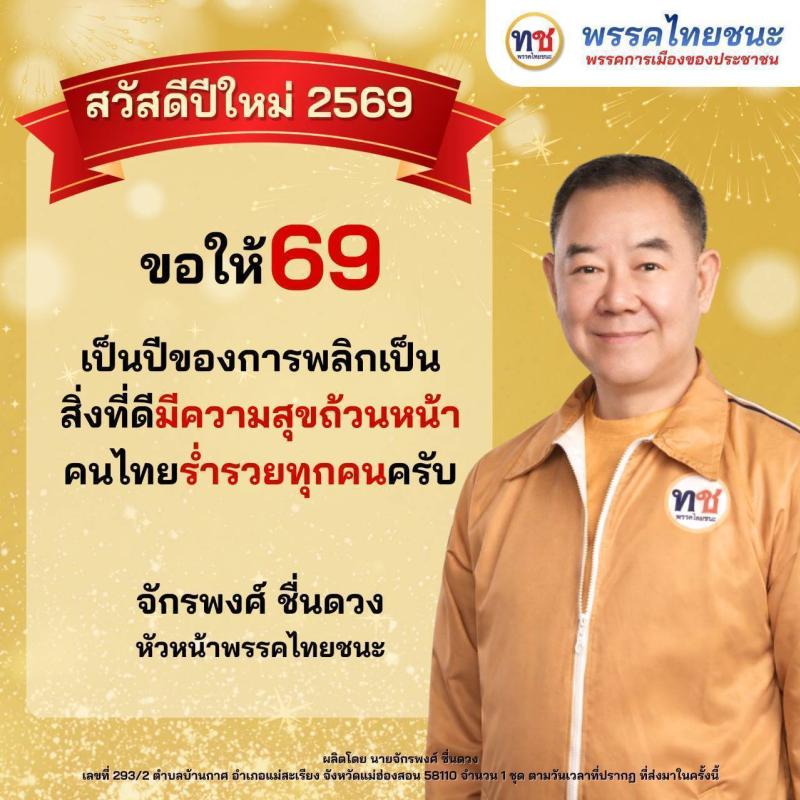 ขออาราธนาคุณพระศรีรัตนตรัยและสิ่งศักดิ์สิทธิ์ทั้งหลายในสากลโลก ได้โปรดดลบันดาลให้ปี 2569 เป็นปีแห่งจุดเริ่มต้นของชีวิตใหม่ ปีแห่งการหลุดพ้นจากความยากลำบาก และเป็นปีที่พวกเราจะก้าวไปสู่ความมั่งคั่งและยั่งยืนร่วมกัน ไทยชนะ คือ ชัยชนะของประชาชนทุกคน