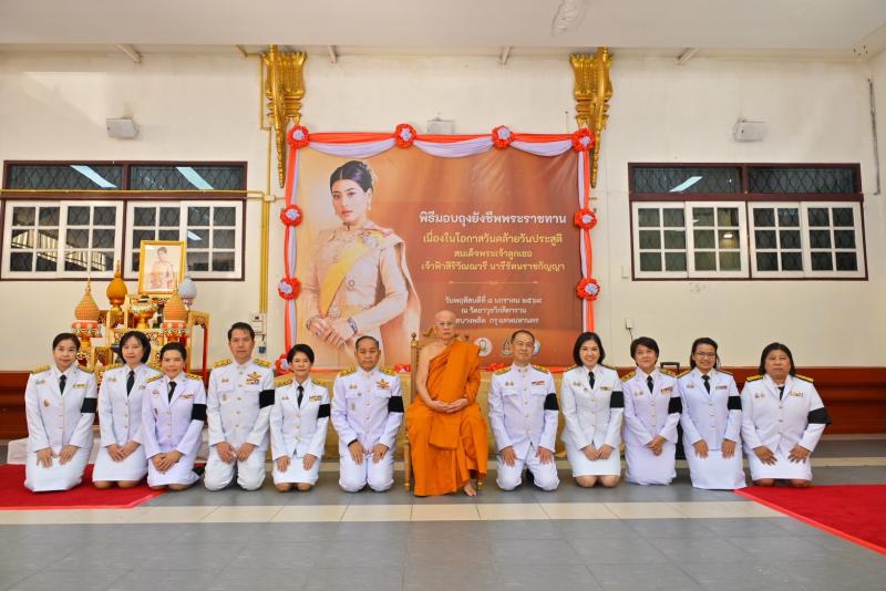 นายประสพ เรียงเงิน ปลัดกระทรวงวัฒนธรรม กล่าวต่อไปว่า “นอกจากการเจริญพระพุทธมนต์ด้วยการสวดพระปริตรของพระสงฆ์ 10 รูปแล้ว ยังมีการมอบถุงยังชีพ เพื่อถวายพระกุศลแด่พระองค์ท่าน ซึ่งถุงยังชีพดังกล่าวพระองค์ท่านทรงพระราชทานมา เพื่อให้เชิญมอบแก่ผู้สูงอายุ ผู้ด้อยโอกาส ผู้พิการ และผู้ป่วยติดเตียง ที่อาศัยอยู่ในชุมชนวัดอาวุธวิกสิตาราม โดยผู้นำชุมชนและสำนักงานเขตบางพลัด เป็นผู้คัดเลือกมาจำนวน 40 คน ทั้งการพระราชทานพระอนุญาต เชิญอักษรพระนามาภิไธย ส.ร.ประดิษฐานบนพัดรอง จำนวน 11 ด้าม และประดิษฐานบนย่าม จำนวน 11 ใบ เพื่อถวายประธานสงฆ์และพระสงฆ์เจริญพระพุทธมนต์ถวายพระกุศล นับว่าเป็นกุศลมงคลที่พวกเราชาวไทยจะได้น้อมเกล้าน้อมกระหม่อมถวายพระกุศล เนื่องในโอกาสวันคล้ายวันประสูติของพระองค์ท่าน ซี่งปีนี้ตรงกับวันพฤหัสบดีที่ 8 มกราคม 2569”