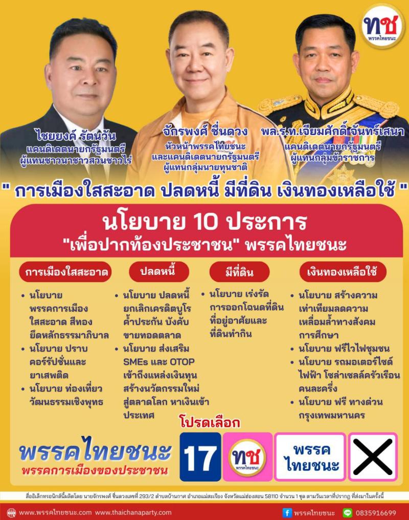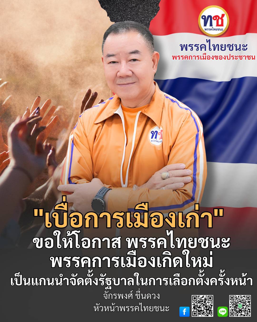 เบอร์ 17 พรรคไทยชนะ ปรับทัพสู้ศึกเลือกตั้ง 8 กพ 69 ฤกษ์ดีต้อนรับปีใหม่ จักรพงศ์ ชื่นดวง หัวหน้าพรรคไทยชนะ กล่าวกับผู้สื่อข่าวว่าวันนี้ กรรมการบริหารพรรคไทยชนะมีมติ แต่งตั้งผู้ใหญ่มากคอนเนคชั่นการเมือง นายทหารที่รักชาติยิ่งชีพ พลเอกอำนาจ สมประสงค์ รับตำแหน่ง ประธานที่ปรึกษาพรรคไทยชนะ ประมุขสูงสุดในฐานะที่ปรึกษาพรรค เพื่อร่วมสร้างพรรคการเมืองที่ใสสะอาด เป็นพรรคการเมืองสีทอง สร้างความหวังให้ประชาชนคนไทยทั้งประเทศ ทำให้ประเทศไทยเป็นประเทศ ศิวิไลซ์เหมือนคำทำนาย เป็นแผ่นดินธรรมแผ่นดินทอง