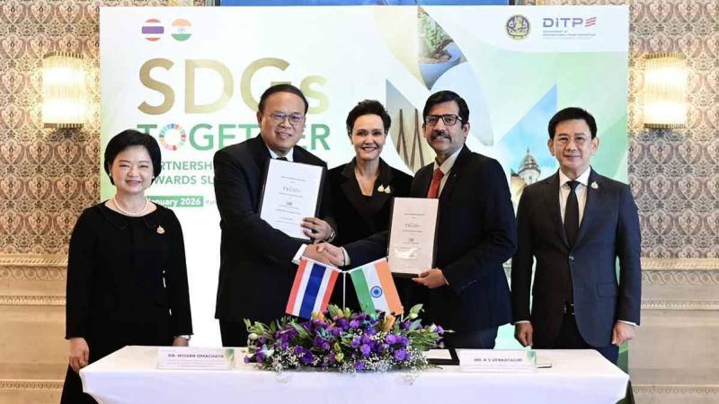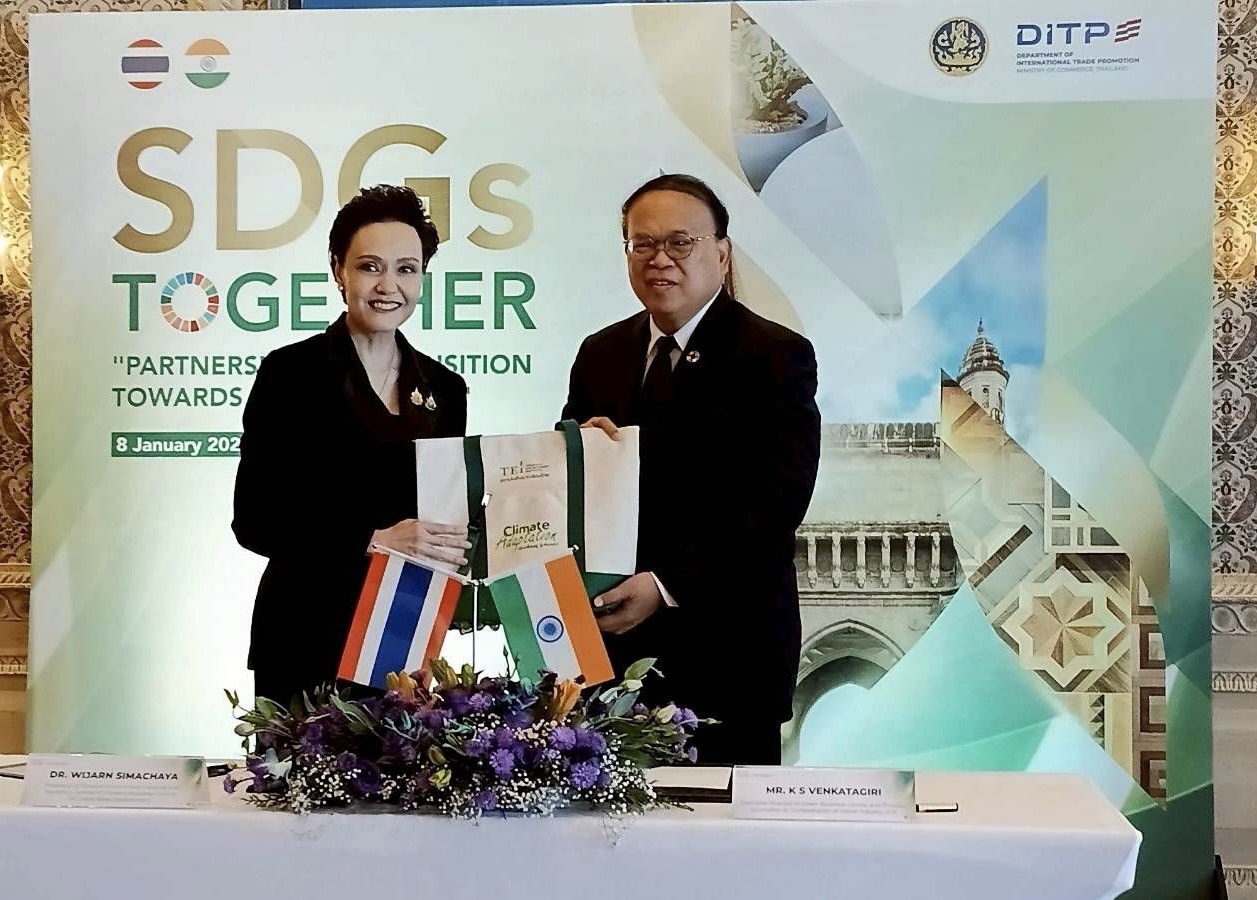 สถาบันสิ่งแวดล้อมไทย (TEI) เดินหน้าผลักดันสินค้าและบริการที่เป็นมิตรต่อสิ่งแวดล้อมของไทยสู่ตลาดอินเดียร่วมกับกระทรวงพาณิชย์ ผ่านการลงนามความตกลงการยอมรับร่วม (Mutual Recognition Agreement: MRA) ระหว่าง Confederation of Indian Industry’s Sohrabji Godrej Green Business Centre (CII–GBC) และสถาบันสิ่งแวดล้อมไทย (Thailand Environment Institute: TEI) โดยมี Mr. K. S. Venkatagiri Executive Director of CII–GBC และ ดร.วิจารย์ สิมาฉายา ผู้อำนวยการสถาบันสิ่งแวดล้อมไทย เป็นผู้ลงนาม ภายใต้นโยบาย SDG Together สร้างความร่วมมือไทย–อินเดียในห่วงโซ่อุปทานภาคการก่อสร้างและอสังหาริมทรัพย์ ผลักดันการยอมรับมาตรฐานสินค้าฉลากเขียวระหว่างกัน โดยมีนางศุภจี สุธรรมพันธ์ุรัฐมนตรีว่าการกระทรวงพาณิชย์ เป็นสักขีพยาน