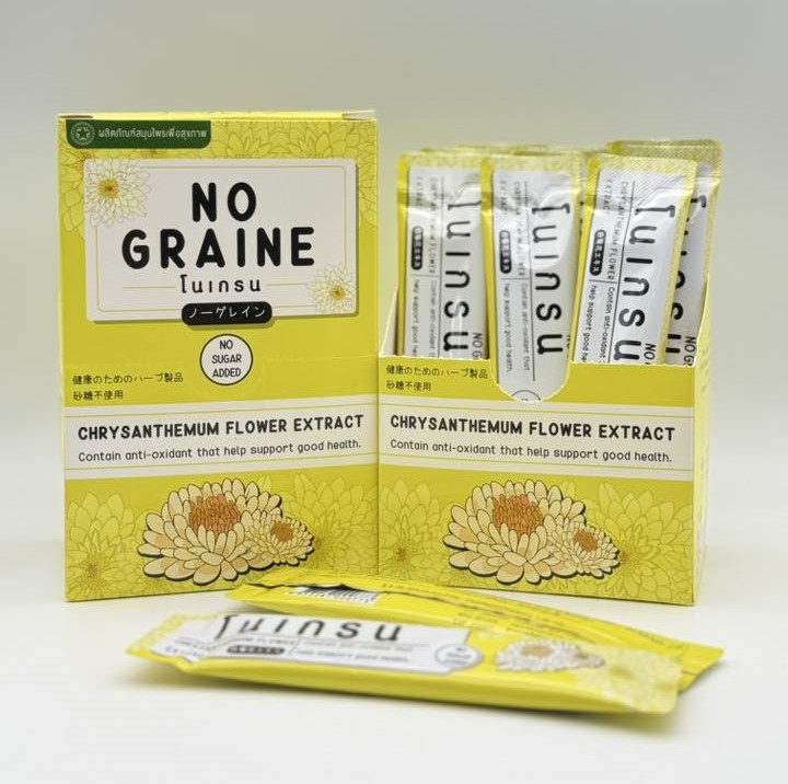ผลิตภัณฑ์ NO GRAINE ... คุณค่าจากธรรมชาติเพื่อคนยุคใหม่ ถูกพัฒนาต่อยอดให้ตอบโจทย์ไลฟ์สไตล์ปัจจุบัน ในรูปแบบผงชงละลายน้ำ (Instant Powder) ที่คงเอกลักษณ์กลิ่นหอมของเก๊กฮวยธรรมชาติ พร้อมชูจุดเด่น สูตรปราศจากน้ำตาล (No Sugar Added) เพื่อให้เป็นผลิตภัณฑ์สุขภาพที่เหมาะสำหรับกลุ่มคนวัยทำงานและผู้ที่มีปัญหาสุขภาพปวดศีรษะเรื้อรัง
